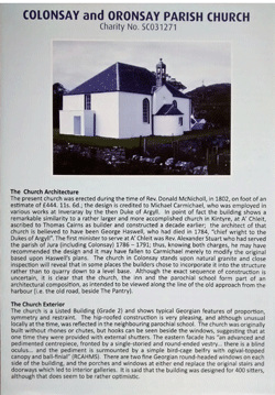 The Parish Church is used by the entire community and is significant to the countless descendants of Colonsay emigrants; hundreds of people visit it each year and this little leaflet was produced to provide a little background information. Hopefully, it will in due course be supplemented by a more comprehensive history, currently in preparation. Copies of the leaflet are also available in the church itself, with proceeds going to the Fabric Fund. Suggested minimum donation £1.00